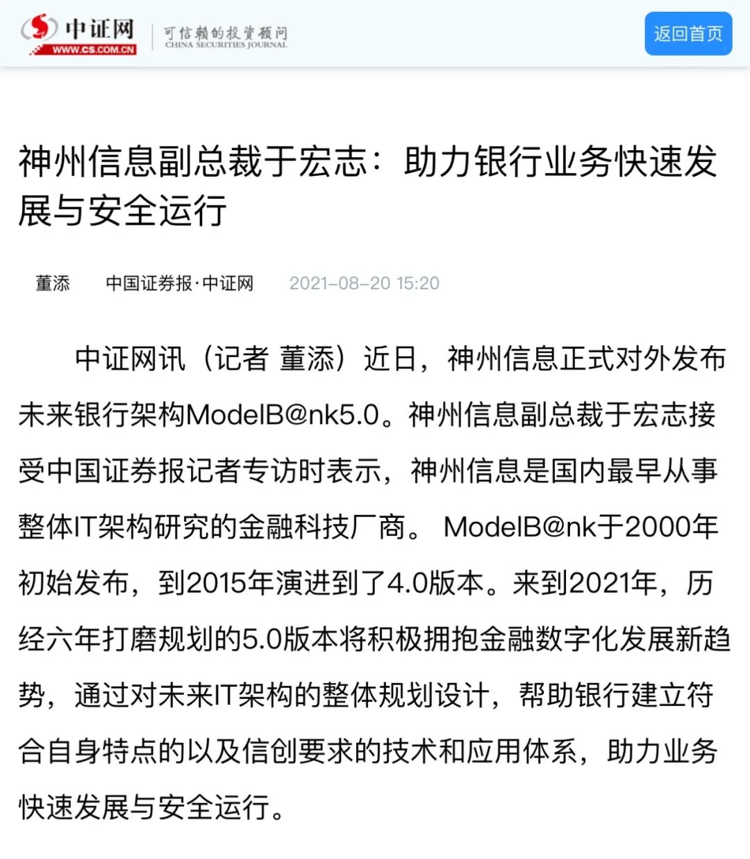 神州信息发布未来银行架构ModelB@nk5.0 持续引领市场!
