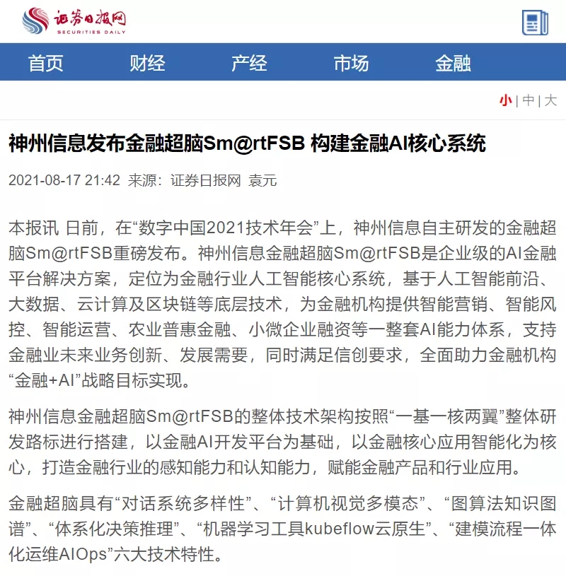 神州信息发布金融超脑Sm@rtFSB 构建金融AI核心系统