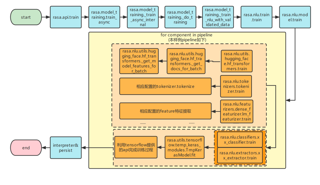 rasa.nlu.model.Trainer.train:遍历pipeline所有components,对每个component调用component.train方法完成训练。在component遍历到DIETClassifier之前,HFTransformersNLP等组件已经提取好了DIETClassifier训练需要的特征。遍历至DIETClassifier后,DIETClassifier开始利用已经提取好的特征进入训练。