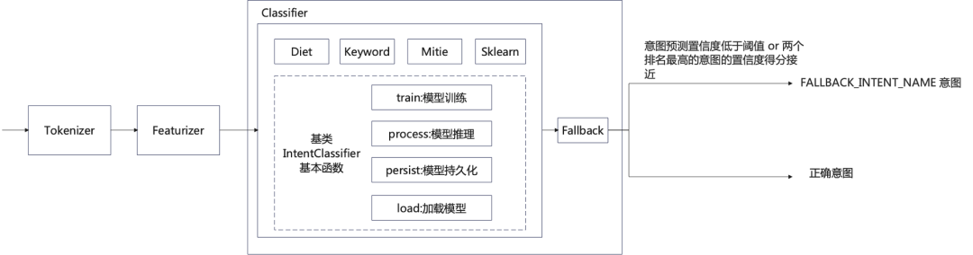 注:(1)FallbackClassifier应出现在某一个意图分类器之后,利用其输出的结果,即intent、confidence、intent ranking,如果意图的置信度比预设的threshold低,或排名前两位的意图的置信度的差距小于预设的ambiguity_threshold,则将该输入的意图分类为“nlu_fallback”