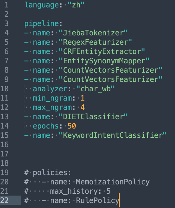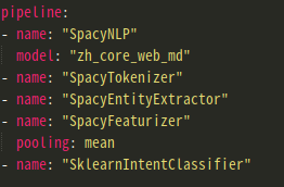 ●Rasa NLU :用于理解用户消息,包括意图识别和实体识别。以pipeline的方式处理用户对话,可在config.yml中配置。