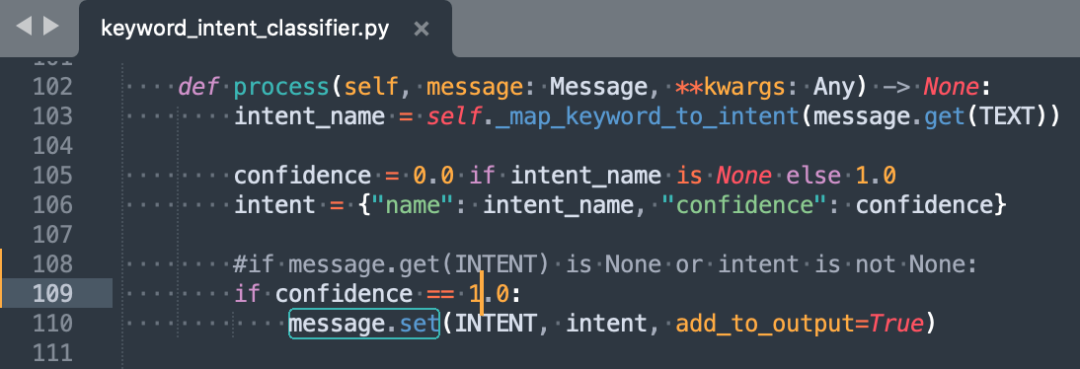 5) 由于Keyword意图分类器位置在pipeline后段,因此不论是否命中原句,其分类结果都将覆盖之前组件结果,因此对源码作如下更改,使得未命中原句情况下,Keyword分类结果不覆盖。这意味着,非原句将采用其他分类器的结果